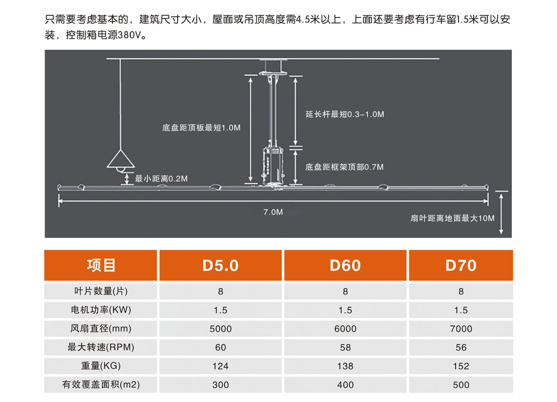 大型工業(yè)吊扇直徑達5-7米,功率為1.5千瓦,風力柔和、無噪音,能滿足200-500平方米的室內(nèi)降溫、通風等要求。