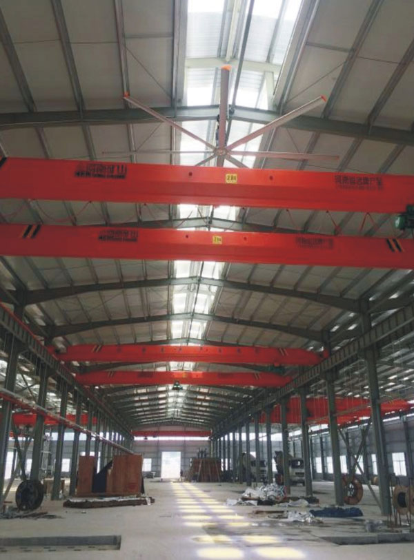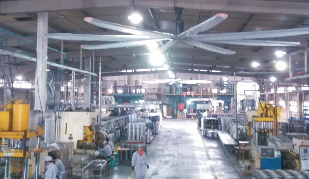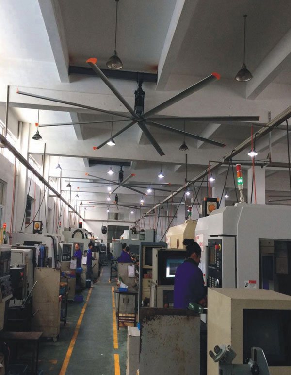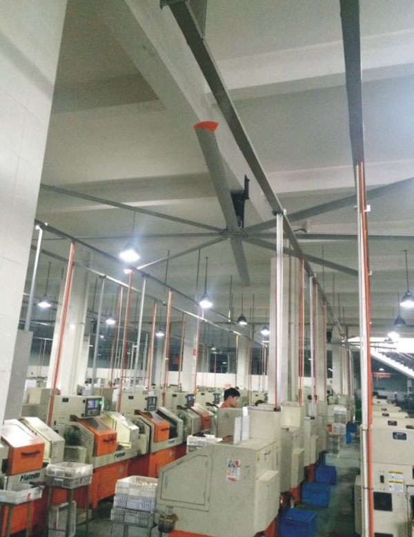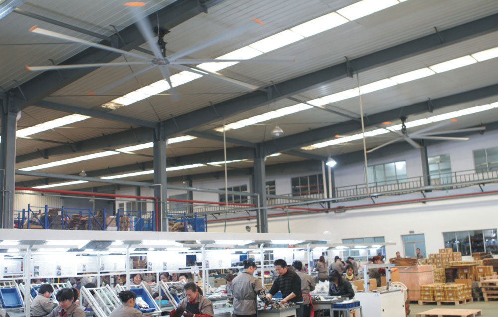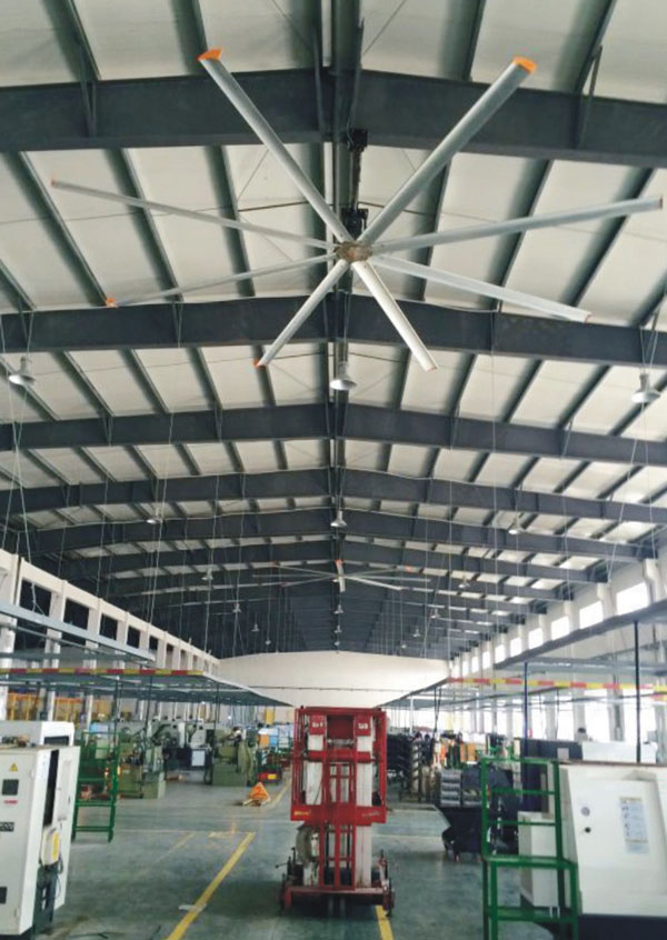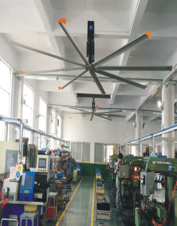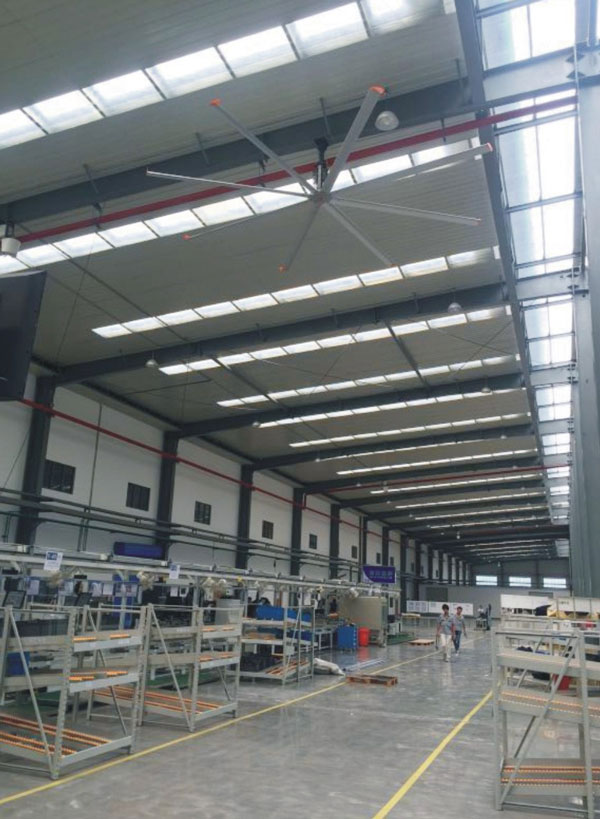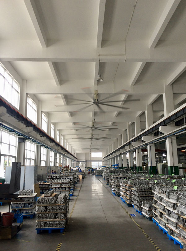 我公司生產(chǎn)的大型工業(yè)吊扇直接懸掛在廠房屋梁下,風力柔和,能加快車間空氣流通,有效降低車間內(nèi)溫度,改善車間空氣環(huán)境質(zhì)量,有利于員工的身體健康。
